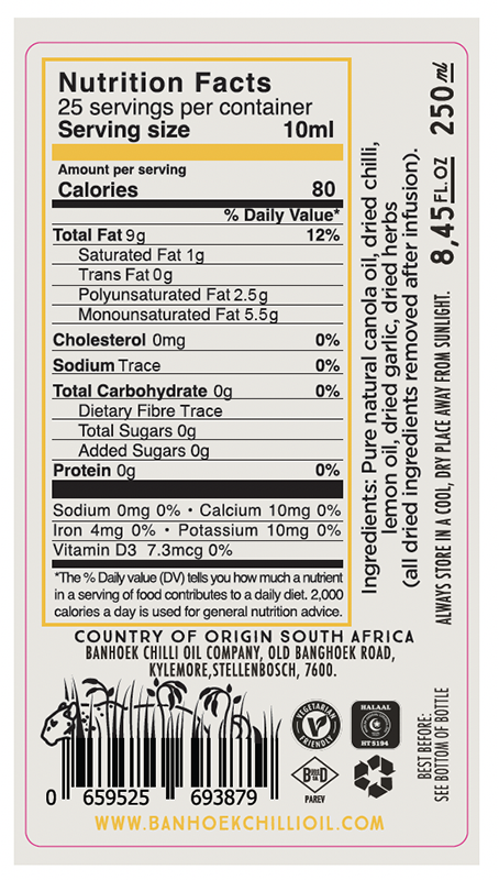 Banhoek Chilli Oil Lemon & Herb - The Original, infused with a gorgeous blend of dried herbs and lemon peel. Perfect to enhance any chicken or seafood dish, potatoes, orzo or a zesty salad dressing.