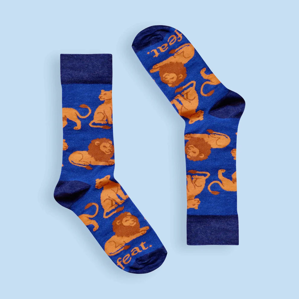 These unique, men’s socks feature the “pride” of the Big Five, Lions, in shades of blue and orange.
