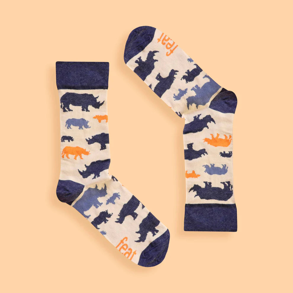 Men’s fun, novelty rhino socks in shades of milk, denim blue and orange.