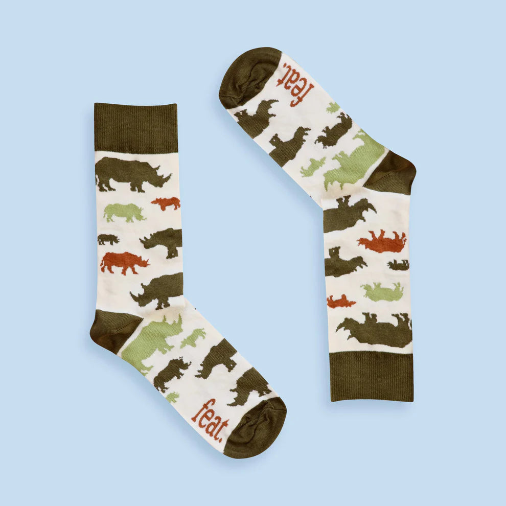 Men’s fun, novelty rhino socks in cream, olive green, medium green and rust cotton-blend yarns.