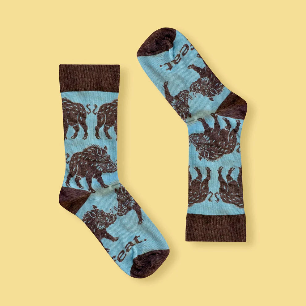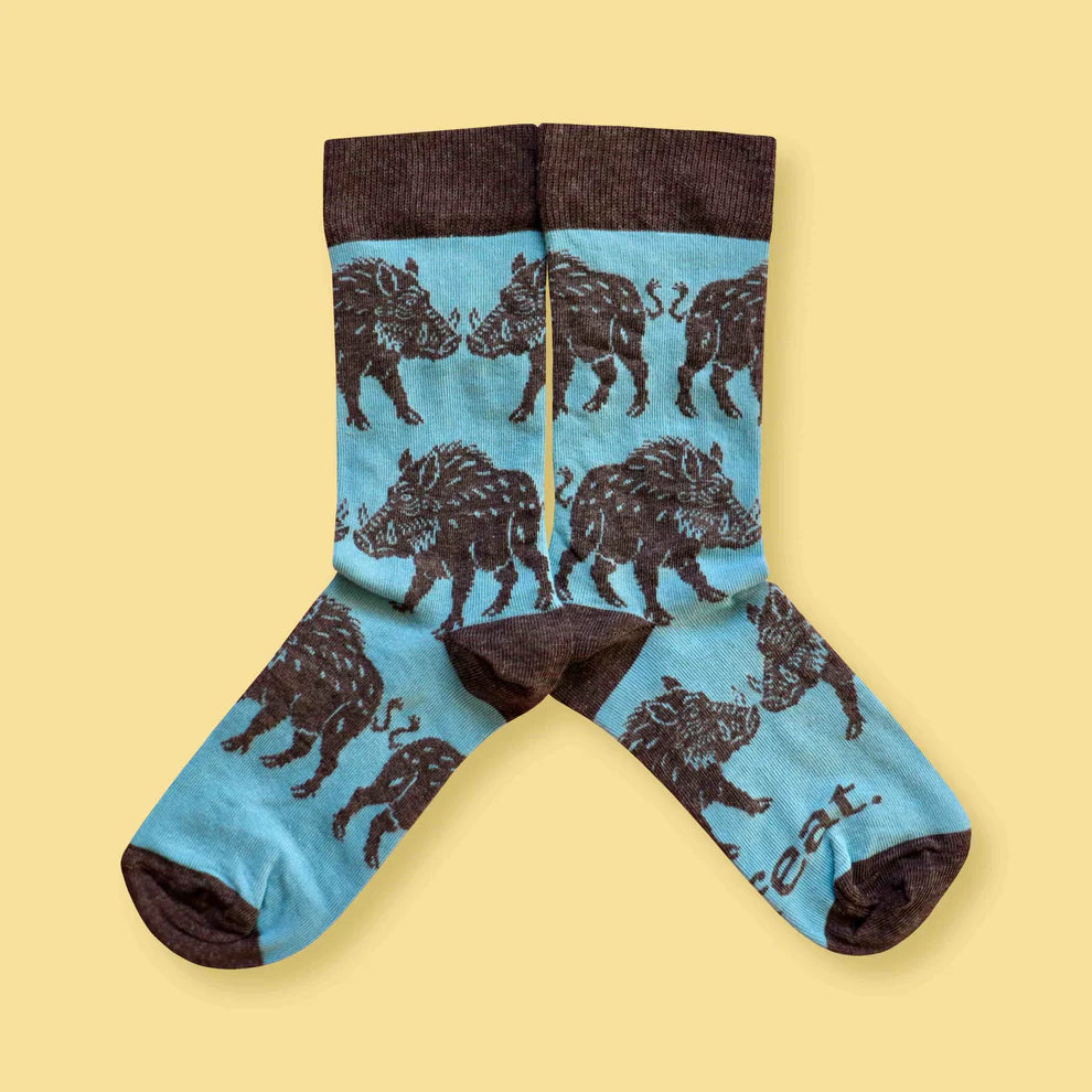 Men’s unique, designer socks featuring warthogs in mottled brown and blue. These designer socks were made in Cape Town.