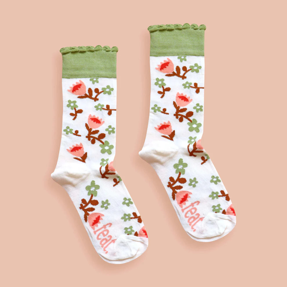 Ladies’ cream cotton socks featuring proteas in peach, orange and rust, along with willow green frill ribbing.