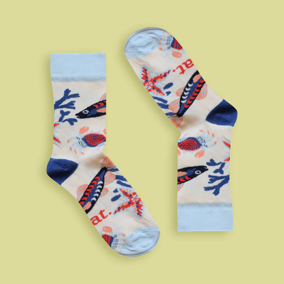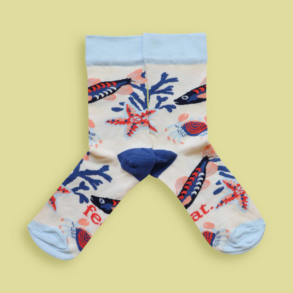 Ladies’ cream cotton socks featuring fish, crabs and shells in shades of blue and peach.