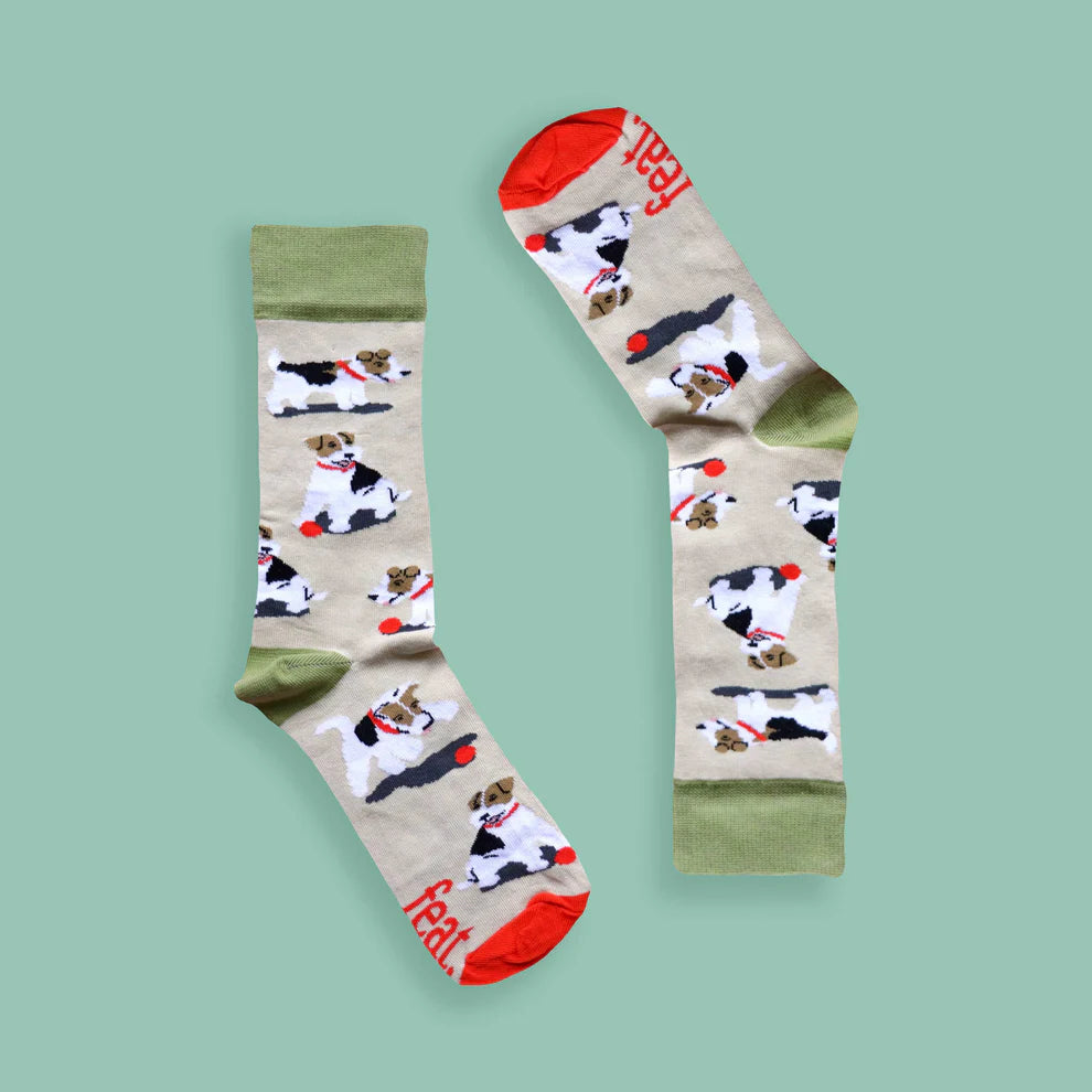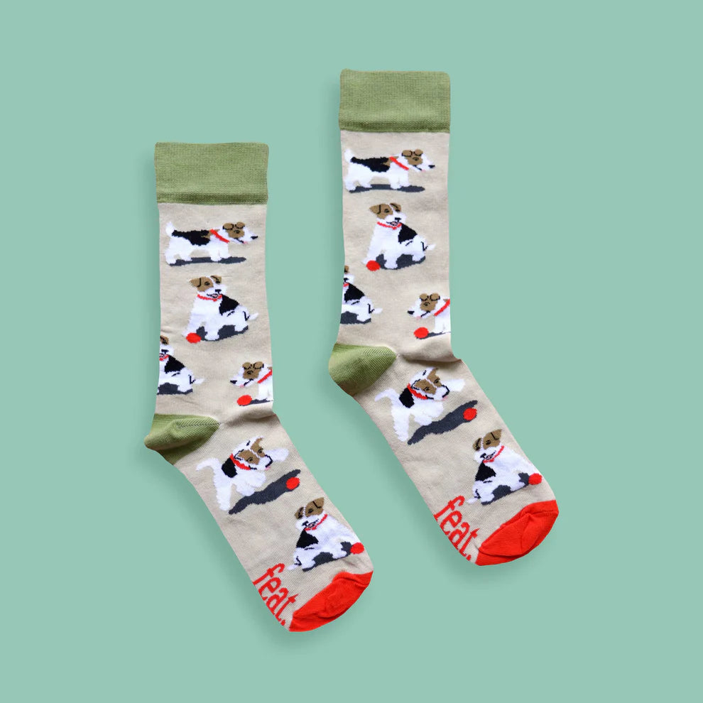 Women’s designer, cotton socks featuring wire haired fox terrier dogs with a ball. This sock design is inspired by our Feat. Designer Goods mascot, Teddie.