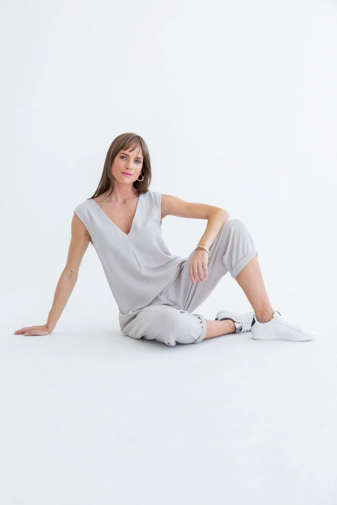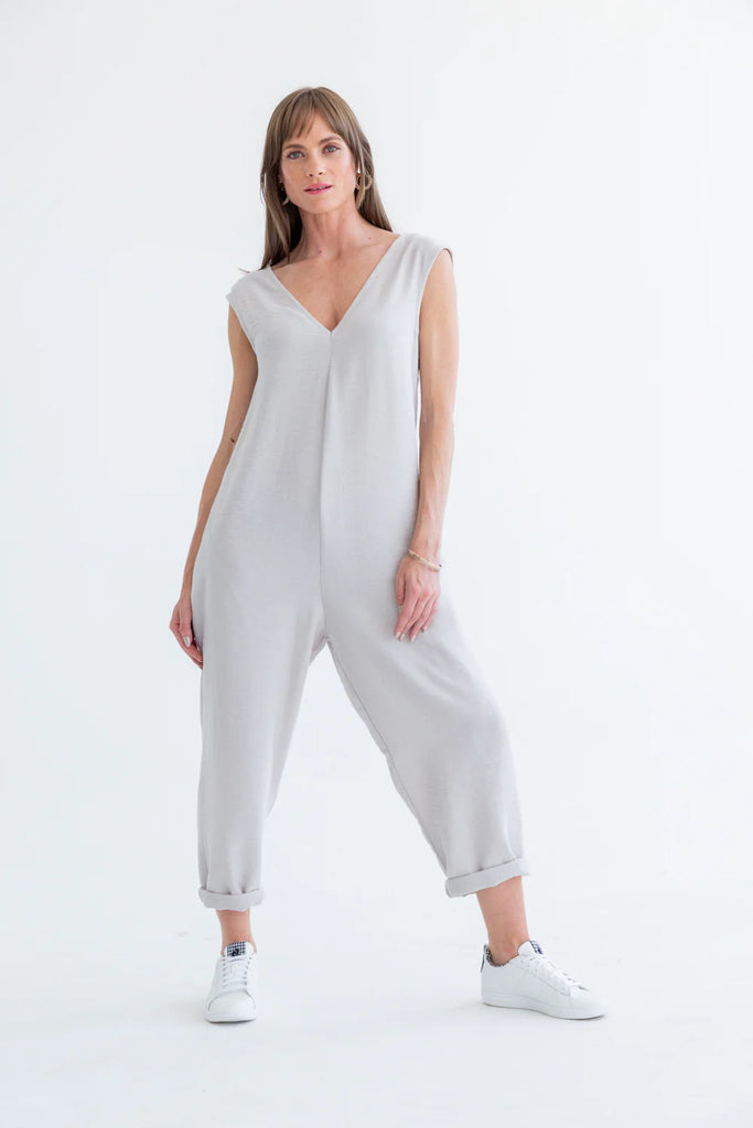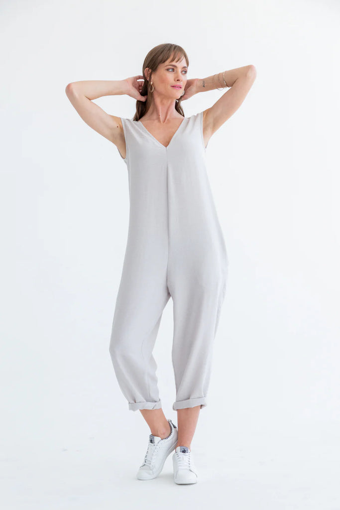 Our linen jumpsuit is a loose fit with deep side pockets. It has a deep V in the front and exact copy at the back. It is super comfy and easily taken from casual holiday wear to lunchtime chic with just a few accessories. It is super comfortable and easy to wear.