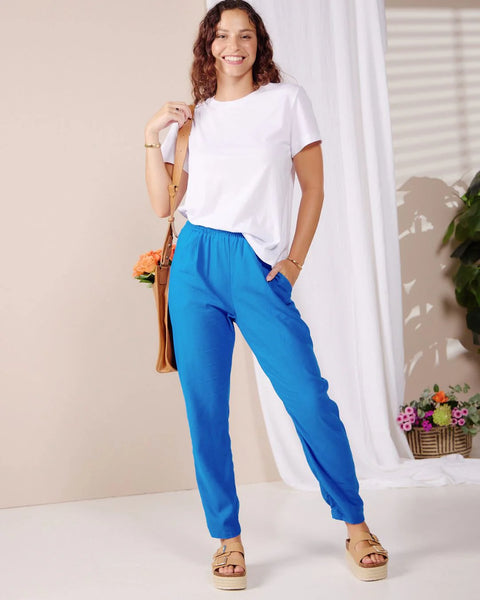 Discover the perfect blend of comfort and chic with the Emma Pants. These versatile pants are crafted from a luxurious mix of linen and rayon, providing both breathability and a smooth, flattering fit. The Emma has an elasticated waistband and pleats on the front. The pants have pockets as well as a patch pocket on the back, the back also has an elasticated hem to create a slim leg fit.