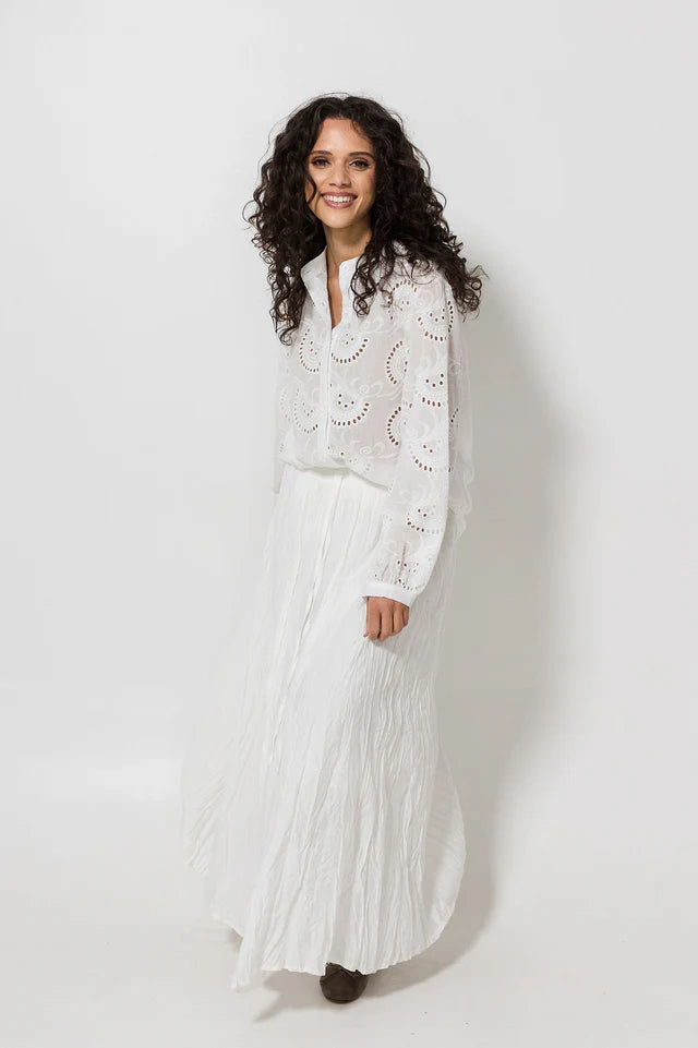 Meet the Nomad Skirt in White! With its crushed texture, this maxi skirt offers depth and surface interest, while the elasticated waist ensures an easy, flattering fit. A timeless silhouette and a key piece for Summer, it’s effortless to wear and endlessly versatile.